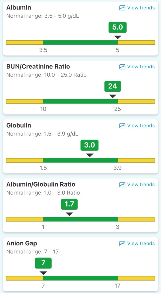 My first appointment was primarily a consultation where we outlined the plan for further testing. I felt an immediate trust in my doctor and was eager to dig deeper into what was happening. Following the appointment, they drew more blood and ran a complete blood count (CBC), a comprehensive metabolic panel, and a series of other tests checking things like vitamin levels and lactate. Below are screenshots of my metabolic panel results from that visit that will hopefully give you a better idea for what a metabolic panel actually consists of.