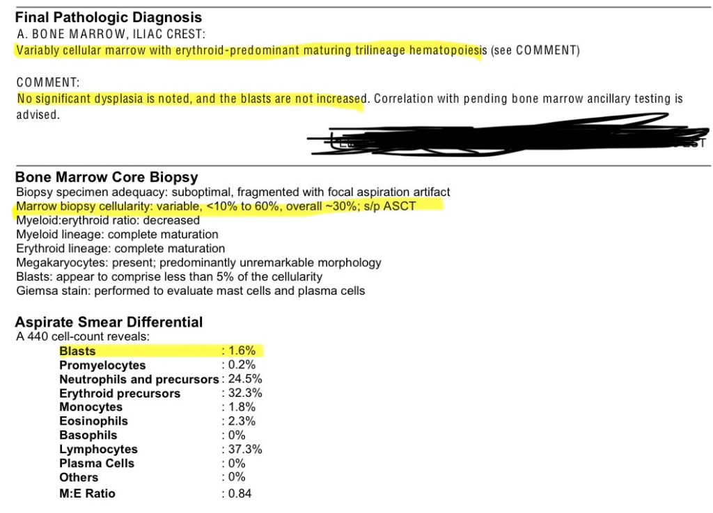 Starting with the pathology report. All three cell lines are developing normally, my cellularity is ranging between roughly 10–60 percent, with an average of about 30 percent, and there is no dysplasia or increased blasts noted.